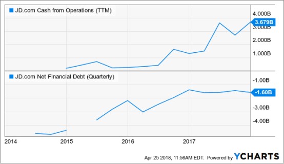 京东的现金流一直保持稳定。目前,公司的运营资金达到了TTM的最高水平,截至2017年底的自由现金流也处于1.99亿美元的最高水平,而一年前仅为7.16亿美元。自2017年初以来,京东一直保持着约16亿美元的净现金头寸。
