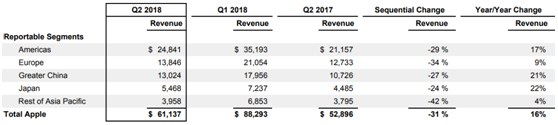 公司服务业务为本期亮点,销售收入增长31%,达到91.9亿美元,超过预期82.6亿美元,是表现最好的一个季度,而且App Store销售额创最高纪录。目前,公司服务业务已经成为公司第二大收入来源,营收份额为15%,公司计划到2020年该业务收入翻一番。