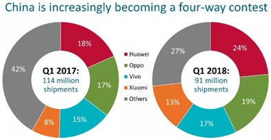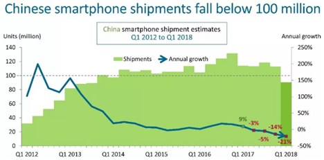 另一方面,有机构研究显示,中国智能手机销量2018年一季度跌破1亿台至9100万台,同比下滑21%,创2013年4季度以来新低。