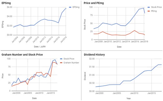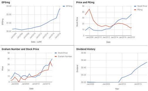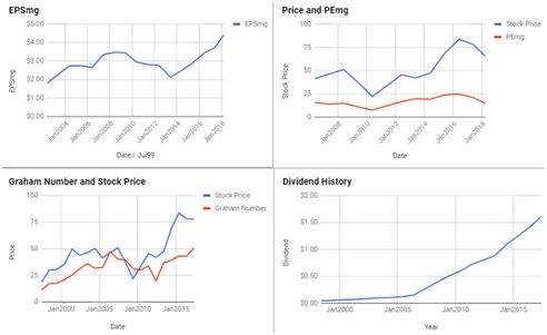 公司目前每股收益从2014年2.48美元到2018年预计增长至4.43美元,其收益增长超过了市场未来7-10年的年化3.14%增长速度,因此基于本杰明格雷厄姆的估值方法,未来公司价值将高于现在的股价。公司每股回馈股东1.81美元,股息收益率为2.8%;目前PE为14.78倍,低于行业平均的43.8倍,可以说是行业内估值水平最低的公司之一。