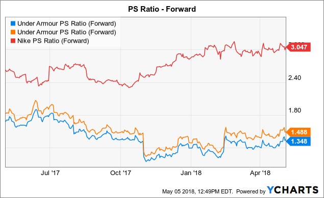 分析安德玛估值最好的办法是将其市销率与耐克相比。从下图可以看出,即使是在公司股价大涨之后,安德玛的市销率仍然仅为耐克的一半左右。