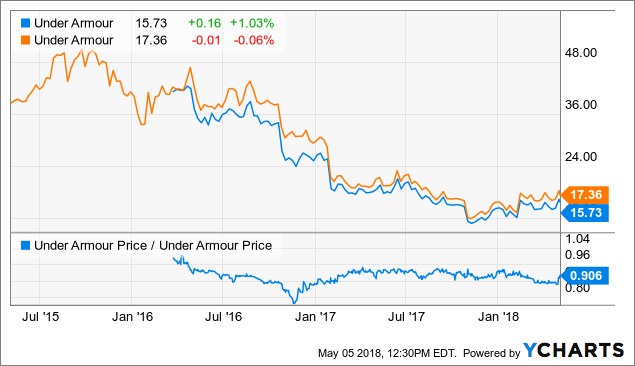 当前市场对安德玛(NYSE: UA)的看法开始转向乐观的一面,笔者认为机会在于公司的C类股票之中。近日安德玛A类和C类股票价格之差创下2016年末以来最高水平,公司C类股票是被低估的,因此对投资者而言更具吸引力。