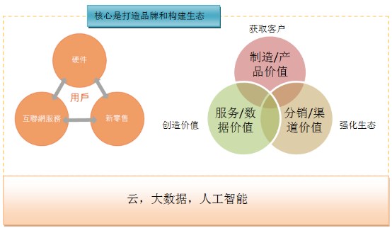 小米商业模式的三项基础:硬件、新零售和互联网服务,分别对应了零售行业生产制造、渠道销售和客户服务环节,在产业链分工上形成完整的链条,同时可以利用终端用户的数据偏好以及强大的粉丝直接交流改善和提高产品设计,从而形成产品链上的闭环。