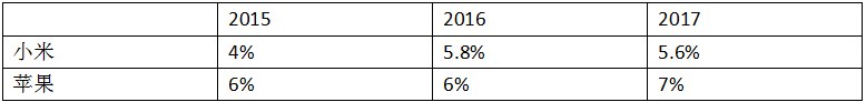 得益于蚕食对手的份额加上2016年的低基数,小米去年的智能手机成绩是非常靓丽的,无论是增长率还是盈利能力都大幅提高。从下图可以看到,在前几大手机品牌中,小米逆势增长非常引人注目。
