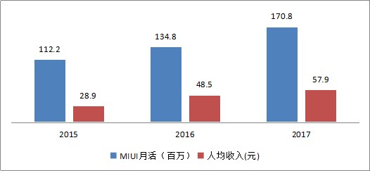 过去三年,MIUI月活人数从1.1亿增长到1.7亿人(最新数据为截止2018年3月月活1.9亿人次),复合增长率24%,人均服务收入不断增长,去年为57.9元(9.1美元),但相比全球领先互联网公司还处于很低的水平。