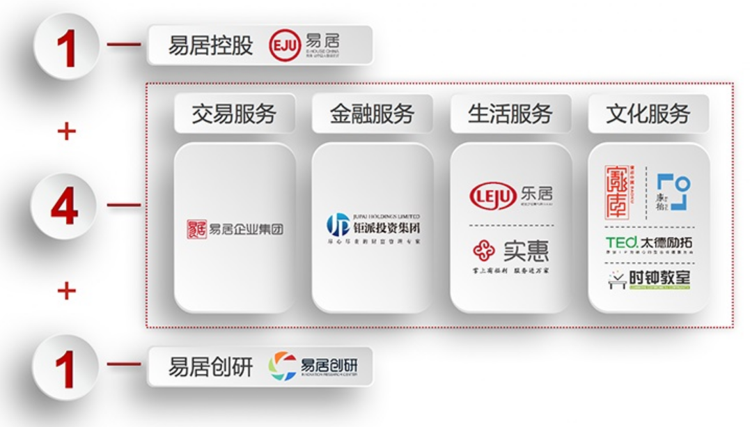 易居企业集团控股股东为易居中国,易居中国定位为房地产全产业链服务商,涉及交易、金融、生活、文化四大领域。易居企业集团将成为易居中国旗下的房地产交易服务业务的上市平台。此外,房地产O2O整合服务平台——乐居控股(交易所代码:LEJU)有限公司和专业财富管理机构——钜派投资集团(交易所代码:JP)已在纽交所上市。