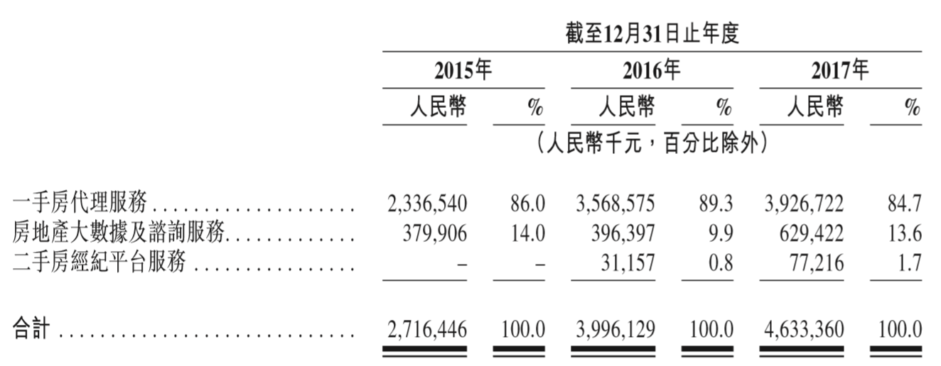 公司主要提供三类服务:(1)一手房代理服务;(2)房地产大数据及咨询服务;(3)二手房经纪平台业务。截至2017年,三者营收分别为39.27亿元、6.29亿元、0.77亿元,占比分别为84.7%、13.6%、1.7%。且三年来业务比例未有太大变化,反映公司各业务均保持较快的增速。下面对三项业务作具体分析: