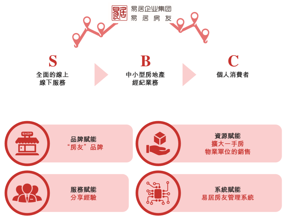 公司在二手房市场开创了一种轻资产的"S2B2C"业务模式,向中小型经纪司提供房友品牌下的全面服务从而帮助其更好地服务于其个人客户。该业务产生的收入主要包括公司通过房友品牌门店及其他合作二手房经纪公司进行一手房代理而收取的佣金。在通常情况下,佣金中的80%将支付促成销售的经纪,并列为分销开支。所以不同于传统连锁加盟模式,"S2B2C"不收取加盟费,而是通过这些房友品牌门店,更好为开发商用户销售新楼盘。