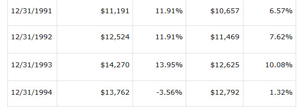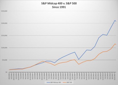 首先要看的是中盘股的总体回报。如果有人将标普500指数与1991年以来的标准普尔400中盘股指数相比,可以看出明显的差异。以下是自1991年以来,每一项指数的初始投资1万美元的情况。