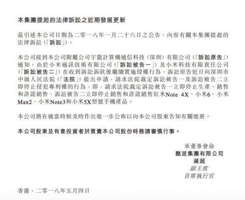 除此之外,酷派前两日发布公告称,对小米科技有限公司侵犯其多项发明专利提起侵权诉讼和行政处理请求,目前已向深圳市中级人民法院提出申请裁定被告停止侵犯专利权的行为。