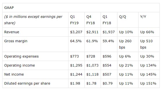 可以看出游戏和数据中心仍然是主要的增长来源,数据中心业务持续强势反映整个行业的景气,从英特尔的财报也可以看出。数据中心在整个2018财年同比增长了133%,虽然目前是公司第二大营收来源,但是增速一直是最快的,公司去年发布的Tesla V100已经成为该部分业务一个主要的产品。