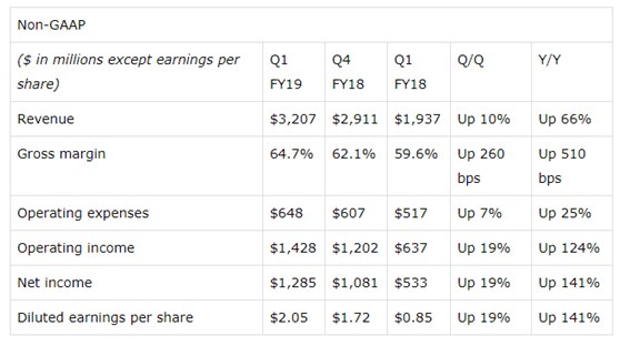 截止4月29的第一季度,公司营收32.1亿美元,同比增长66%,环比增长10%,超出分析师预期3.1亿美元;