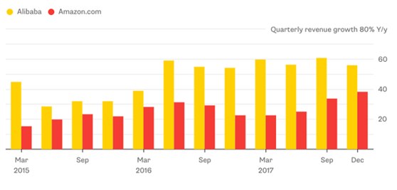 过去两年,阿里云计算按季增长都在50%以上,云计算老大亚马逊的增速大约少一半,同期,阿里的股票回报率是88%,亚马逊是97%。