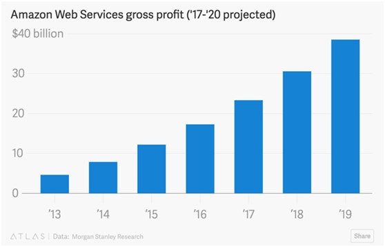 摩根士丹利预计亚马逊AWS毛利在2020年会达到400亿美元,同时表示了如果亚马逊的市值能达到万亿,那么AWS将值2700亿美元,因此推断AWS的前瞻PS大约是6.75倍。