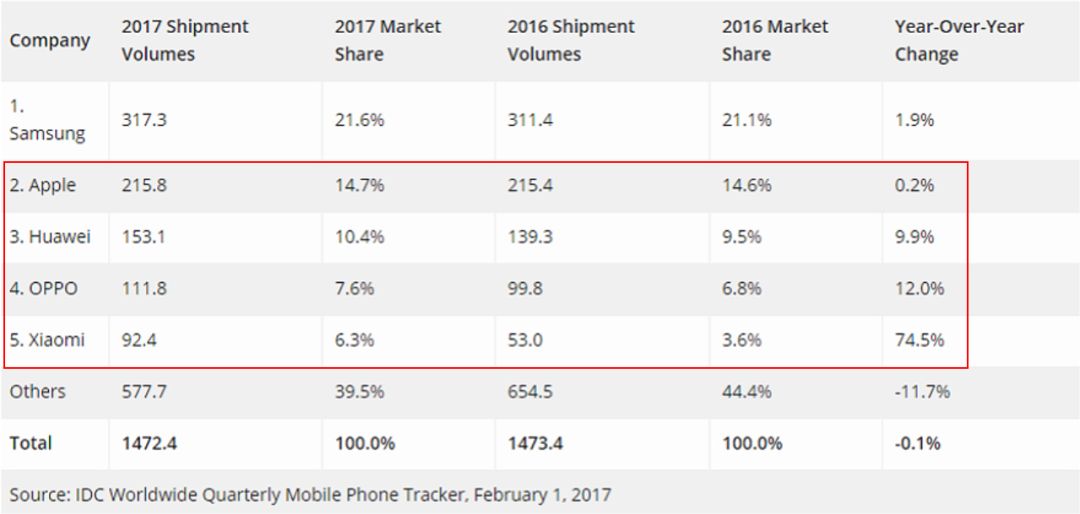 数据来源:IDC;2017年各大手机厂商的全球出货量数据,苹果、华为、OPPO和小米位列前五名
