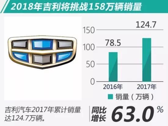 数据来源:网上车市;2017年,吉利汽车销量首次突破100万大关,问鼎自主车企销量冠军;2018年,吉利将迎来产品大年