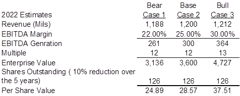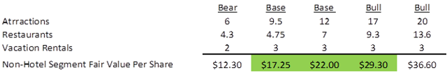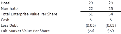 通过回顾非酒店部门估值的多种情况,使用的许多数据都非常保守,公允价值范围在每股22-25美元不等。下文将用29美元作为酒店业务的公允价值,这与基本情况的估值是一致的。
