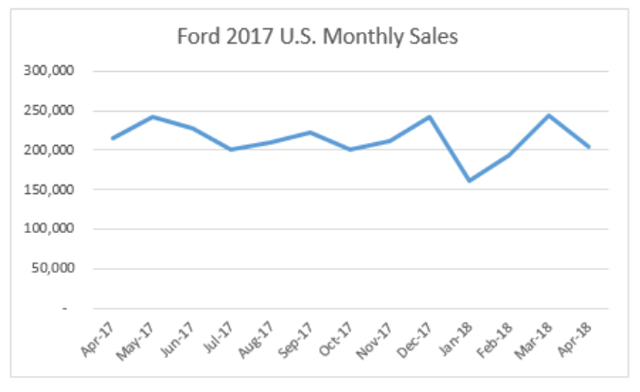 下图显示了福特过去12个月的美国市场月销量情况。除今年一月以外,福特的月销量都在20万辆至25万辆区间。即使是在销量同比下滑的今年四月,福特的汽车总销量也与过去12个月平均月销量水平保持一致。