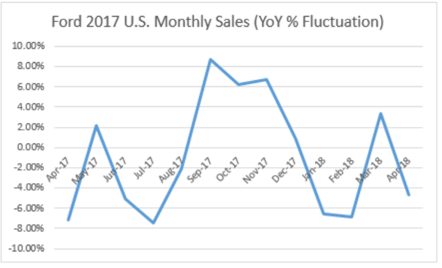 下图是福特过去12个月的美国市场汽车月销量同比变动曲线。从图中可以看出,福特的月销量表现不稳定,波动较大,此外,去年四月汽车销量同样出现下滑。