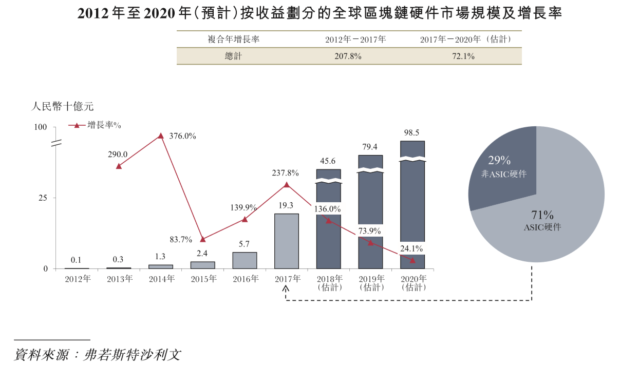 比特币矿机的行业规模在2016年及2017年比特币价值上升及推出新挖矿机的驱动下强劲增长。根据弗若斯特沙利文,全球区块链硬件的销售收益从2012年的人民币70百万元增长至2017年的人民币193亿元,复合年增长率为207.8%,预计至2020年按72.1%的复合年增长率增长至人民币985亿元。虽然增速将放缓,但72.1%的复合增长率似乎仍然值得期待。