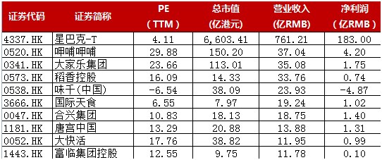 公司2017年收入106.37亿元,净利润为11.94亿元,已经是行业内体量最大的,但相比于巨头星巴克还是有很大的差距,而且二者可比性不强;公司主要还是要和呷哺呷哺做对比,公司基本上是其营收和净利润的3倍,海底捞关联公司颐海国际有机构给予的2018年PE为25.59倍。