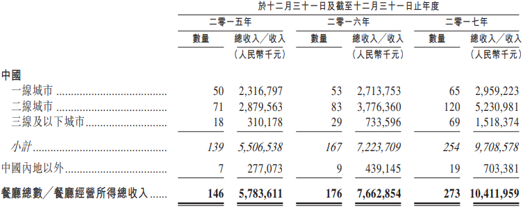 公司全球餐厅网络从2015年初的112间,到2017年底迅速增长为273间,最新数据显示公司已经拥有及运营餐厅数量达320间;其收入由2015年的57.57亿元,到2017年增长为106.37亿元,年复合增长达35.9%;利润从2015年的4.11亿元到2017年11.94亿元,年复合增长率更是达到70.5%。