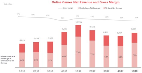 同样的时间,行业老大的腾讯则以一副强者恒强的姿态出现:营业收入735.28亿元,同比增长48%;净利润232.9亿元,同比增长65%。其中网络游戏收入为287.78亿元,同比增长26%:受益于《QQ飞车》《王者荣耀》等游戏表现良好,手游收入约217亿元,同比增长68%,环比增长28%;曾经一度被《阴阳师》拉下榜首的《王者荣耀》,伴随着深度运营,用户价值进一步提升,目前日活仍高达4500万,今年可能还将保持较快的收入增长。