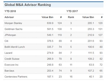 各类兼并收购活动重新抬头是件好事,对高盛的业绩能起到巨大利好作用,能通过附加融资和风险管理服务产生杠杆效应。目前无论是从科技、医疗健康、科技金融以及能源等行业,各地理区域还是主动并购和被动并购的动机来看,并购活动都十分活跃。并购活跃利好投行业务。截至2018财年第一季度,高盛的投资银行积压业务环比增长,原因是预计与并购相关的潜在咨询交易净营收将大幅增加。