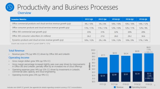 具体而言,截至2018财年第三季度,Office 365商业版的月度活跃用户数量高达1.35亿,与此同时,Office 365个人版的订阅用户数量目前达3060万。按照固定汇率计算,Office 365商业版该季度营收相比去年同期大增40%,从而使微软三季度的毛利率达65.4%,同比略有增长。备受争议的微软仍然能使公司毛利率继续扩张,这显示了公司管理层的决策执行相当出色。