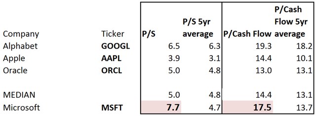 微软当前市净率为7.7,远超过去五年平均的4.7,同时也高于谷歌、苹果、甲骨文等同行的市净率。微软当前市现率为17.5,仅次于谷歌的19.3,同时远高于过去五年平均的13.7。