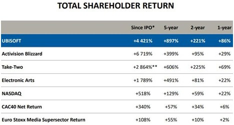 虽然EA在Live Services方面近年成绩不错,但相比于同行业其他公司仍有很大差距。行业其他对手例如育碧,其玩家循环消费或游戏微交易系统收入同比增长59%,收入达到4.83亿美元。《彩虹六号:围攻》可以说是育碧Live Services的典范,其上市之后广受玩家诟病,但在公司不断的更新修正之后,与去年大火,玩家规模不断创出新高,并于今年公司和腾讯合作进入中国。此外,通过下图可以看出,EA在回报股东方面,也落后于育碧及其他厂商,但是高于纳斯达克平均水平。