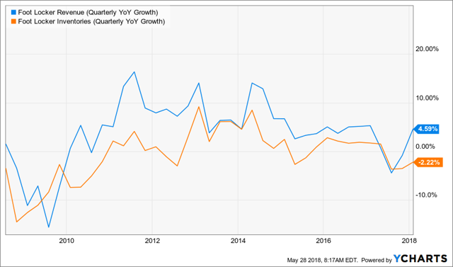 与所有零售业务一样,成功的关键之一是库存管理。在第一季度末,Foot Locker的库存为12.1亿美元,比去年同期下降了5.4%。在固定汇率下,库存下降了7.1%。为了清楚地看到公司实际管理库存的情况,下图展示了它与销售收入的关系。