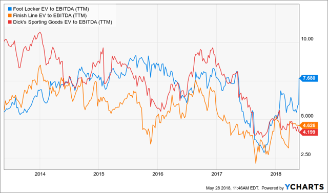 与Finish Line和Dicks体育用品相比,Foot Locker是估值最贵的公司。目前,Foot Locker的 EV/EBITDA 接近7.7 x,而Finish Line为4.26x。Dicks体育用品是最便宜的,EV/EBITDA为4.2x。