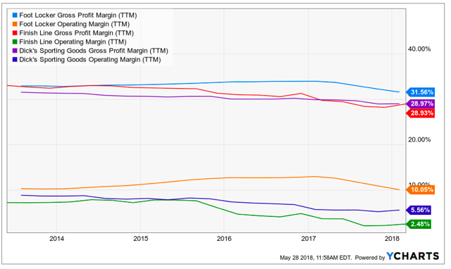 由于毛利润率和营业利润率高于其他两家公司,所以Foot Locker的估值更高也合理。该公司的营业利润率为10%,而Dicks体育用品和Finish Line的营业利润率分别为5.56%和2.48%。
