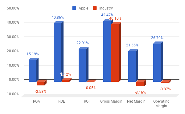 下面的图表显示了苹果公司对比行业平均水平的资产回报率(ROA),股本回报率(ROE),投资回报率(NYSE: ROI),毛利率,净利率和经营利润率。 在考虑的所有指标中,该公司优于平均水平。