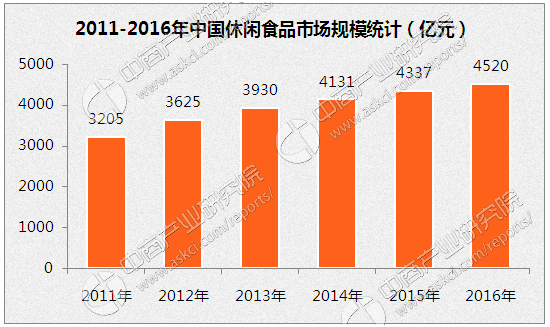 具体而言,据中商产业研究院发布的《2017-2022年中国休闲食品行业发展前景及投资机会分析报告》显示,2011年至2016年期间,中国休闲食品销售量从1350万吨增长至1625万吨,年均复合增长率达3.78%。预计2018年全国休闲食品销售量有望达到1749万吨。2011年至2016年期间,中国休闲食品市场规模从3205亿元增长至4520亿元,年均复合增长率达7%。预计2020年中国休闲食品市场规模将超过6200亿元。