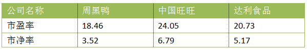 从市盈率和市净率来看,周黑鸭的目前估值相对较低。周黑鸭目前的市盈率为18.46,低于中国旺旺的24.05和达利食品的20.73。公司目前市净率为3.52,而中国旺旺和达利食品分别为6.79和5.17,周黑鸭的市净率同样低于后两家公司。