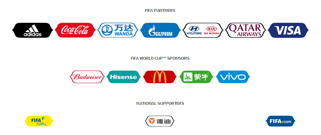截至5月31日,2018年俄罗斯世界杯官网上一共列出了15家赞助商及合作伙伴,多家中国企业现身。这15家赞助商包括7家国际足联合作伙伴(阿迪达斯、可口可乐、万达、俄罗斯天然气、现代起亚、卡塔尔航空、Visa)、5家2018年俄罗斯世界杯赞助商(百威、海信、麦当劳、蒙牛(雅士利附属享有)、vivo),以及3家区域赞助商/国家支持商(FIFA公平竞赛、雅迪、FIFA.com)。