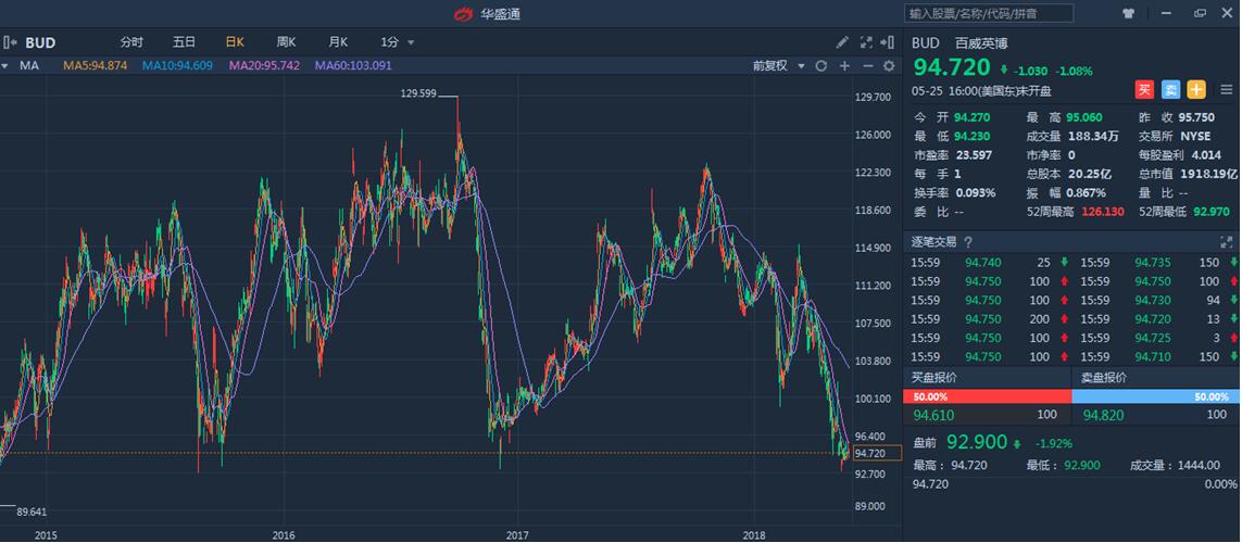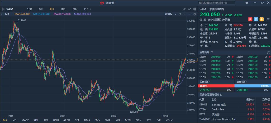 国外啤酒市场,在大名鼎鼎的百威之下,做精酿的波士顿啤酒显得很小众,但是股价走势远远好于百威。自2015年高点下滑以来,目前股价已经成功反转,距离去年年中的最低点已经接近翻倍。