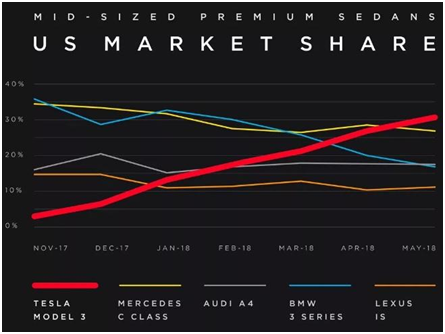 近日,马斯克向投资者表示,Model 3的产能将在本月达到每周5000辆,目前公司生产线产能为每周3500辆。通过下图可知,随着公司产能的逐步释放,Model 3在美国的市场份额也不短提升。