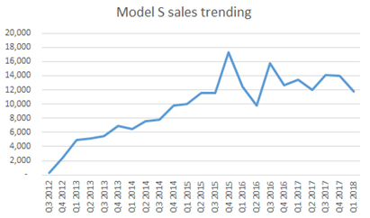 首先,统计公司Model S的稳定销量,通过下图可知,Model S经过14个季度,销量基本达到峰值,在2015年第四季度之后逐渐稳定在12000辆的水平。