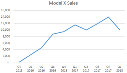 其次,Model X则经历了8个季度销量达到峰值,目前销量基本稳定在10000辆的水平。