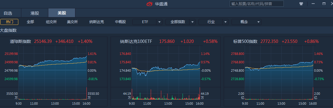 周三美股大涨,道指涨近350点,升至三个月高位,金融股领涨。截至收盘,标普500收涨0.86%,道琼斯涨1.40%,纳斯达克涨0.67%。
