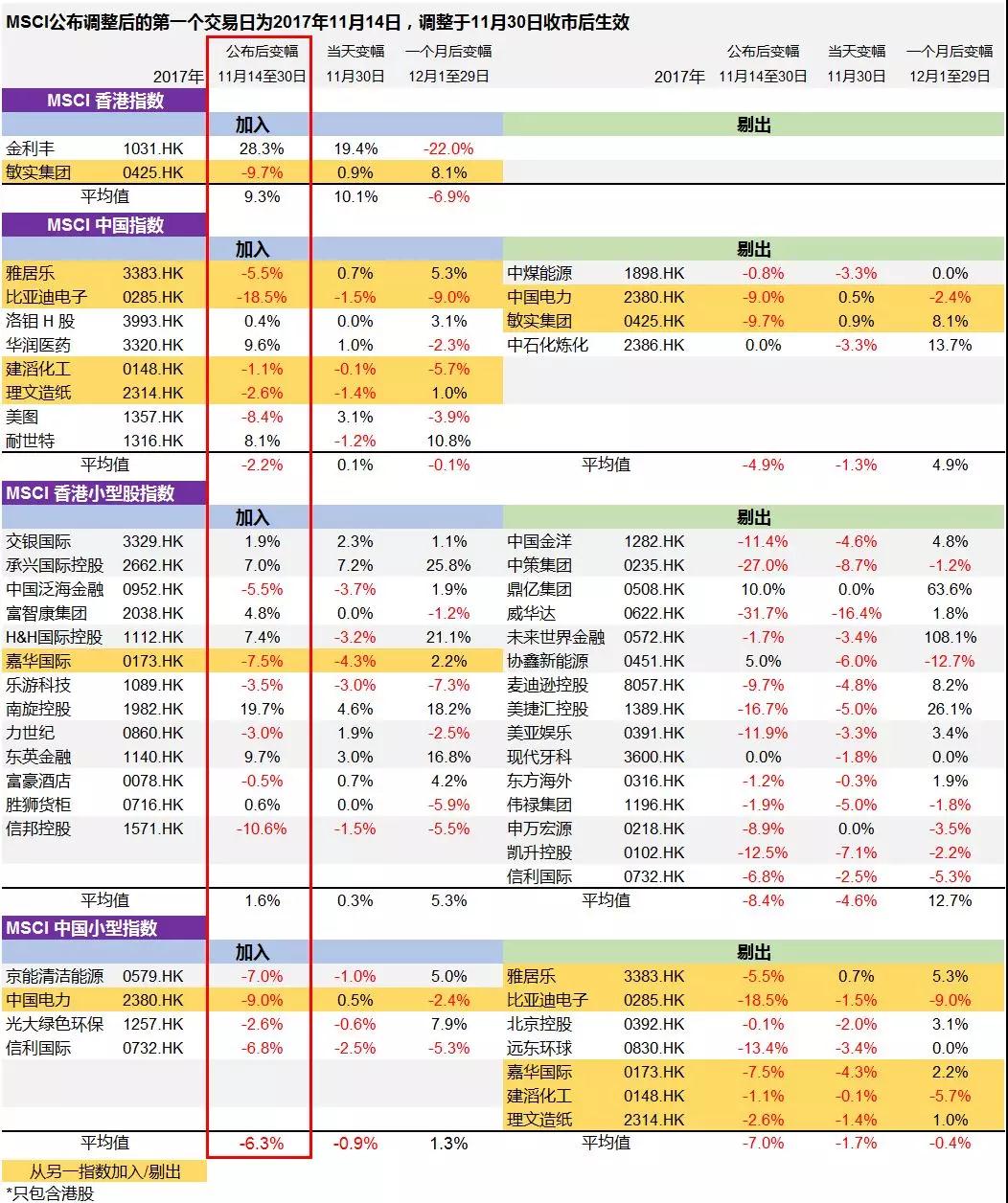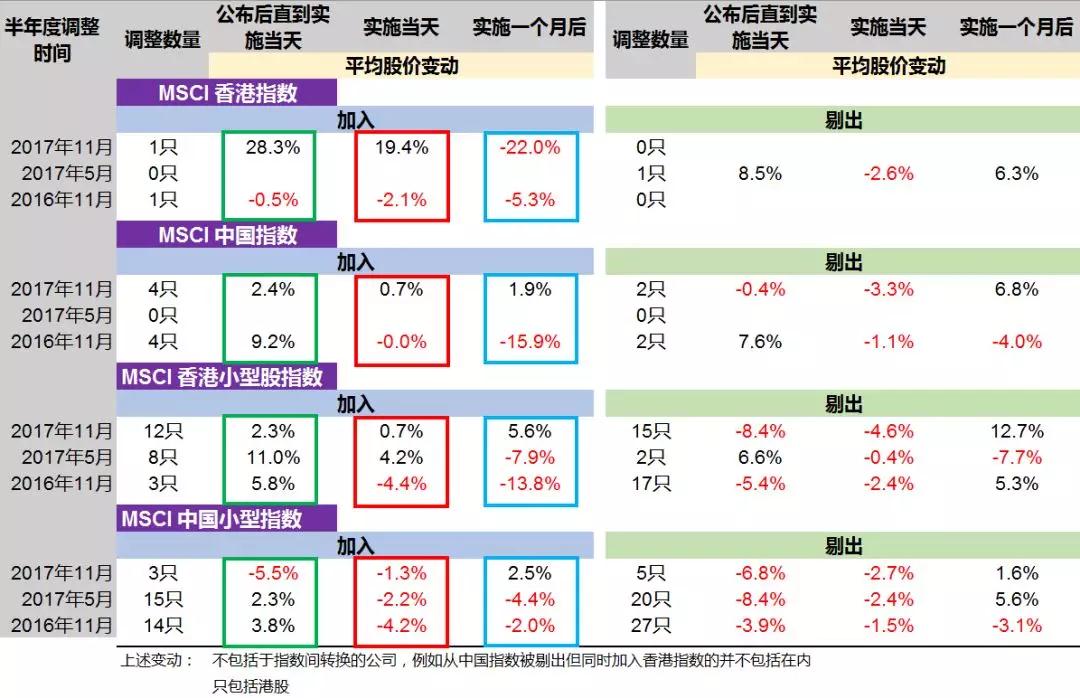 根据2016年和2017年当中的三次MSCI半年度调整记录,从平均值看,在实施调整的当天,被加入的公司其股价并不一定会上涨(红框)。相反,被剔除的公司都会普跌。