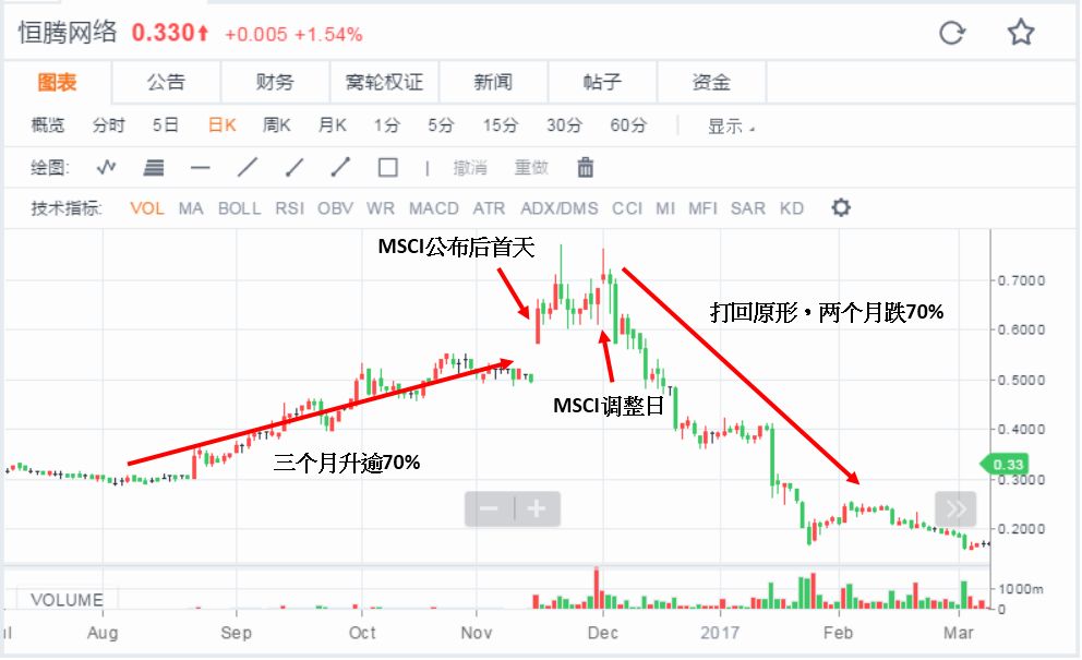 恒腾网络(0136.HK)于2016年11月14日被纳入MSCI 中国指数,11月30日进行调整,日成交额大增至13亿港元,这是平日成交额的10倍以上。