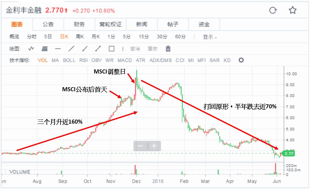 因此,每当到MSCI半年度调整的实施日,被加入或剔除的股票都会出现大成交量。而这种被动型基金死板的进股机制,也衍生出“炒MSCI调整”的玩法。