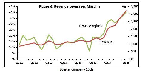 与此同时,Nvidia完全享有“边际杠杆”,运营利润率随收入增长而增加。Nvidia在人工智能方面的早期投资将开始回报,随着利润率稳步上升50%,预计GPU 2018年营业利润率将超过55%。