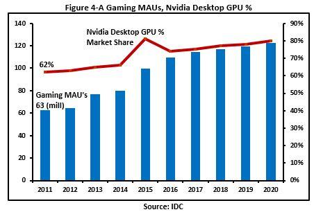 电子竞技的普及对中档/高档GPU的需求增大、3到5年的GPU更新周期以及匹配产品发布等多个因素作用下,预计其游戏收入将以中等以上的速度增长。到2020年,预计Nvidia的台式机GPU市场份额将达到80%。游戏月活人数MAU与桌面GPU销售高度相关,因此Nvidia的GPU长期复合年增长率将从最近的25%降至12%-14%。过去五年,该公司的游戏收入每年增长13%。