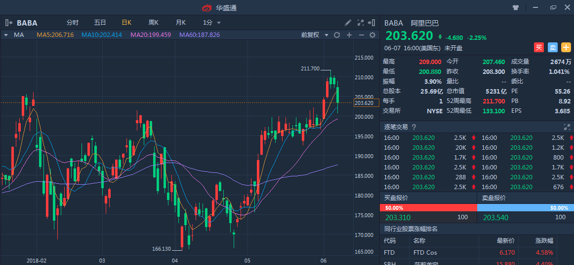 目前市场的担忧是阿里是否估值过高。而就两个月前,投资者还叹息其他科技股大涨的时候阿里股价却表现疲软。阿里一直在积极进行相关领域的战略投资和收购来增强公司实力,这点确实令人欣慰。知名做空机构香橼从看空阿里到看多阿里的转变也从侧面表明了阿里或许是一直不错的股票。此外,“618”(6月18日)购物节到来,媒体纷纷对阿里和京东等电商给予关注。购物节期间交易额可能会破纪录,从而有望推动公司股价短线上涨。