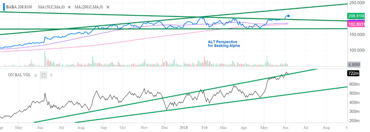 仅在一个多月前,中国互联网巨头阿里巴巴(NYSE: BABA,下文简称阿里)股价触及164美元的支撑位。其实公司股价仅在四月就两度接近支撑位。笔者在四月初撰文提到,阿里有巨大潜力,公司拥有本土优势,所处的中国市场人口数量远超美国,但阿里股价却并未大涨。